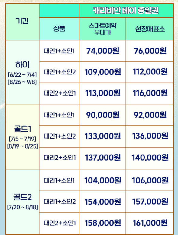 캐리비안베이도 오션월드와 마찬가지로 시즌별 (골드 > 하이 > 미들) 가격 차이가 나는데요.