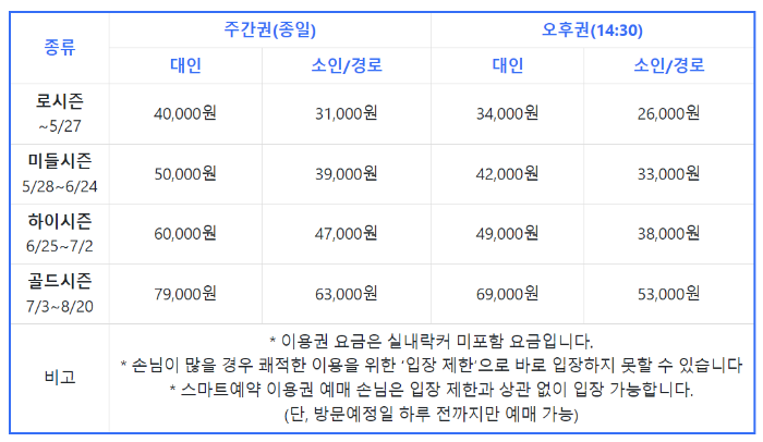 캐리비안베이도 오션월드와 마찬가지로 시즌별 (골드 > 하이 > 미들) 가격 차이가 나는데요.