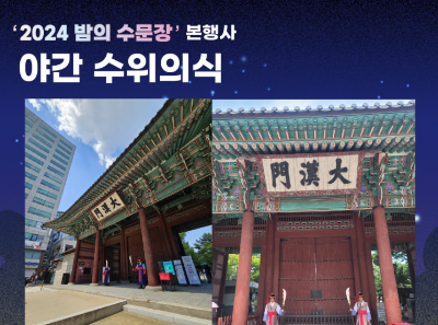 | 18:00 ~ 18:30 | 야간 수위의식 | * 리얼수문장 체험 '본투비 수문장' 19:00 ~ 20:00 (매주 금/토요일) * 수문장과 함께하는 청사초롱 역사투어 19:30 ~ 21:00 (매주 금/토요일) 전통복식 체험 (매주 금/토요일) 18:00 ~ 21:00 |
